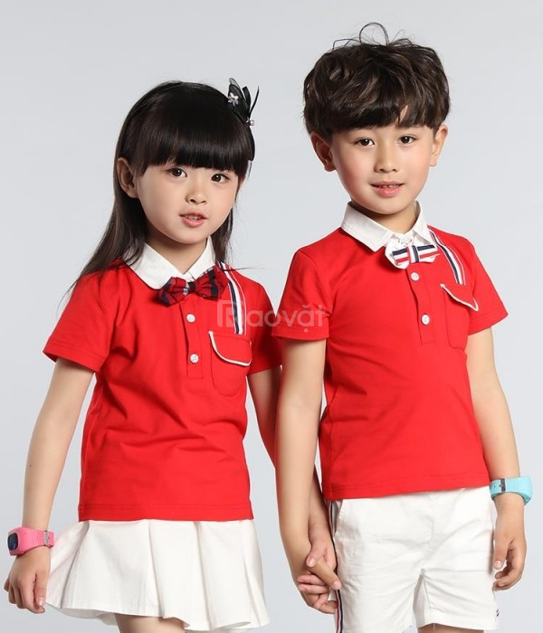 - Thiết kế hiện đại, lịch sự: Đây là một mẫu đồng phục học sinh tiểu học mùa hè. Bộ đồng phục bao gồm áo polo đỏ, phối cùng chân váy cho bé gái, quần short màu trắng cho bé trai. Logo trường học được in/thêu ở ngực trái áo polo, giúp tăng khả năng nhận diện thương hiệu trường học.